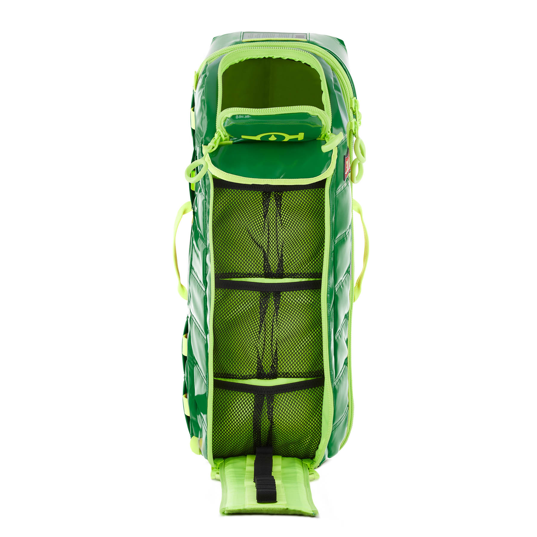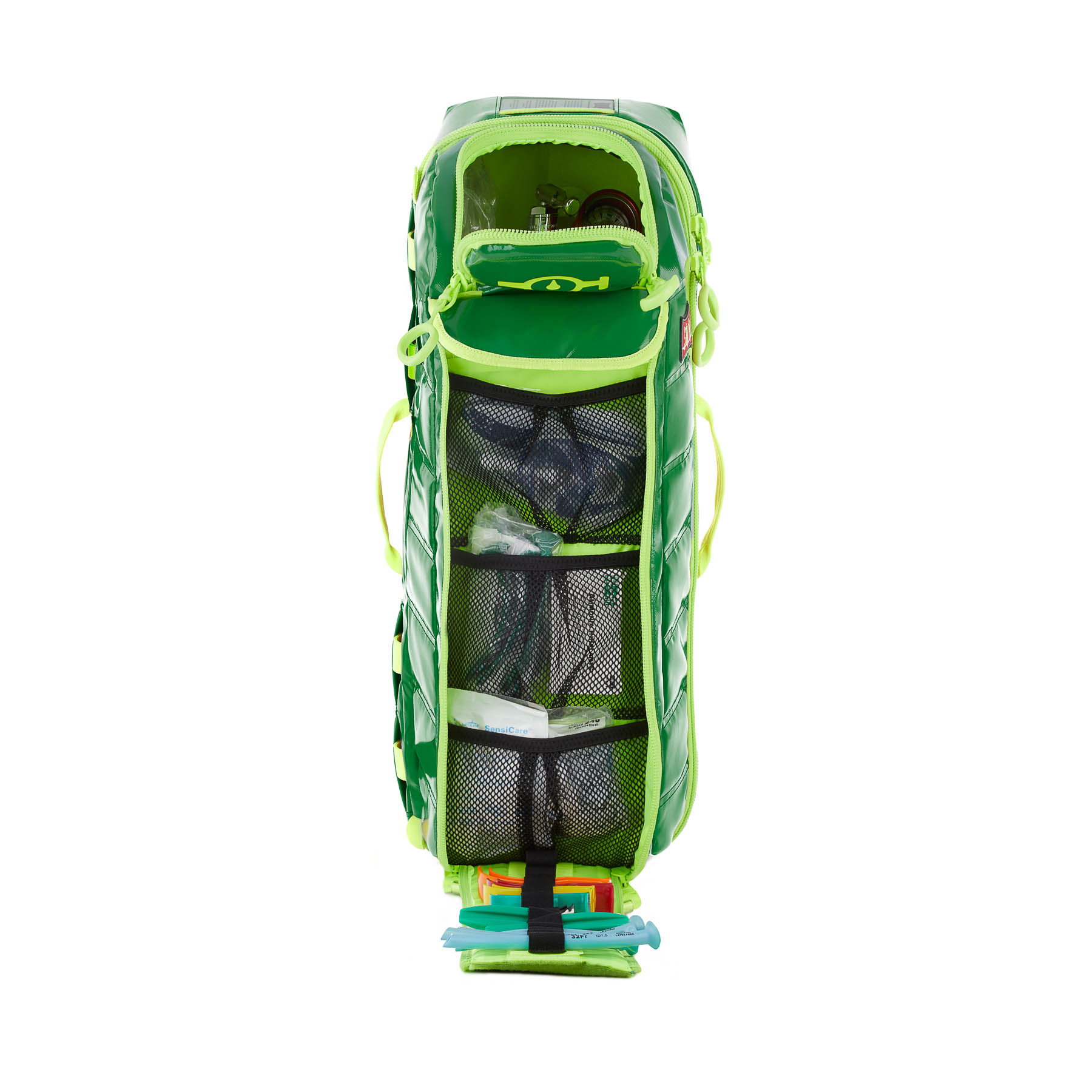 Securely holds a regular or jumbo D-Size tank, carries multiple pockets and oxygen and suction units as well as tubes, masks, and bvms.